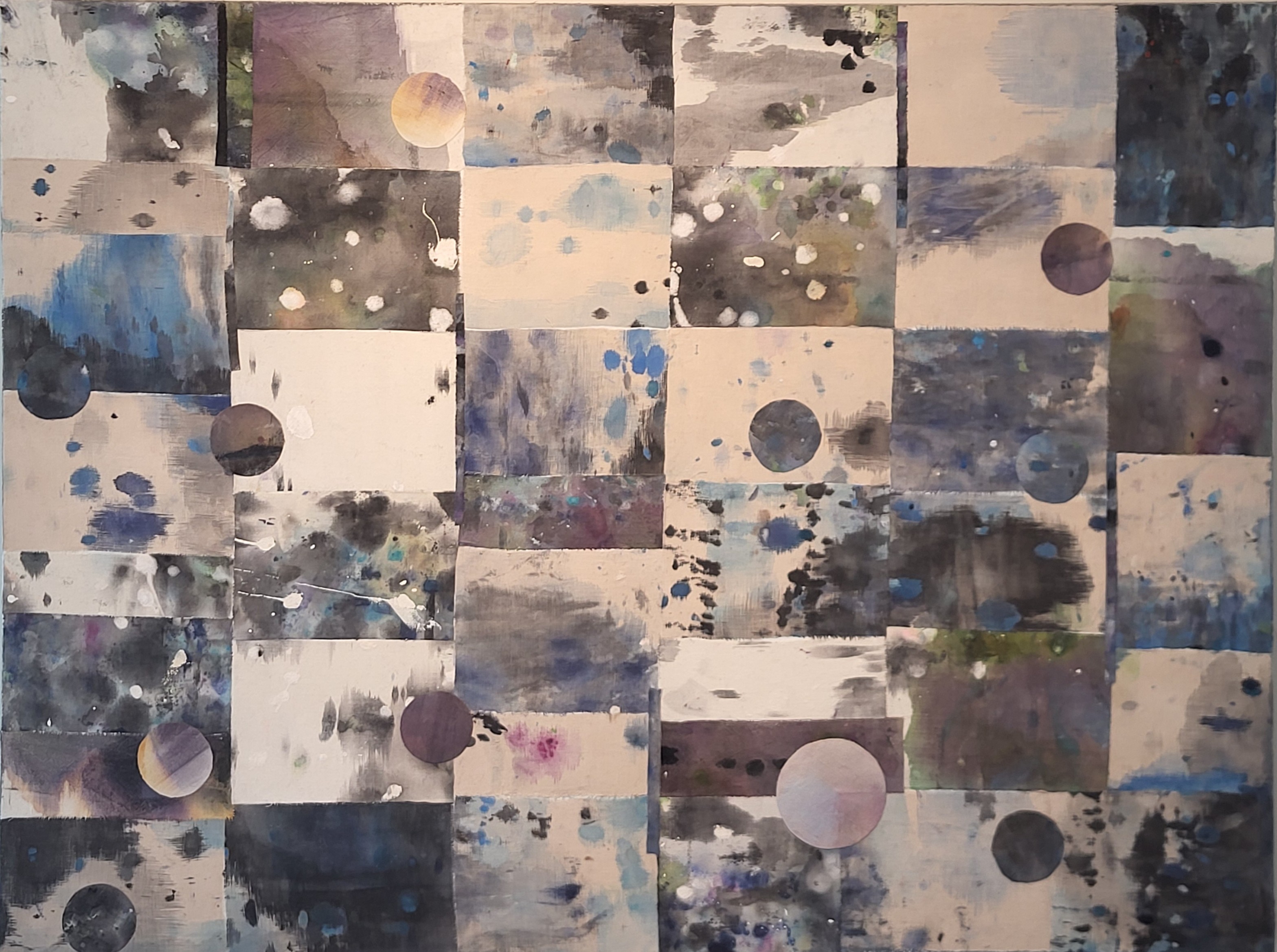 Cosmos textile collage and acrylic on stretched canvas, 30" x 40", $2750