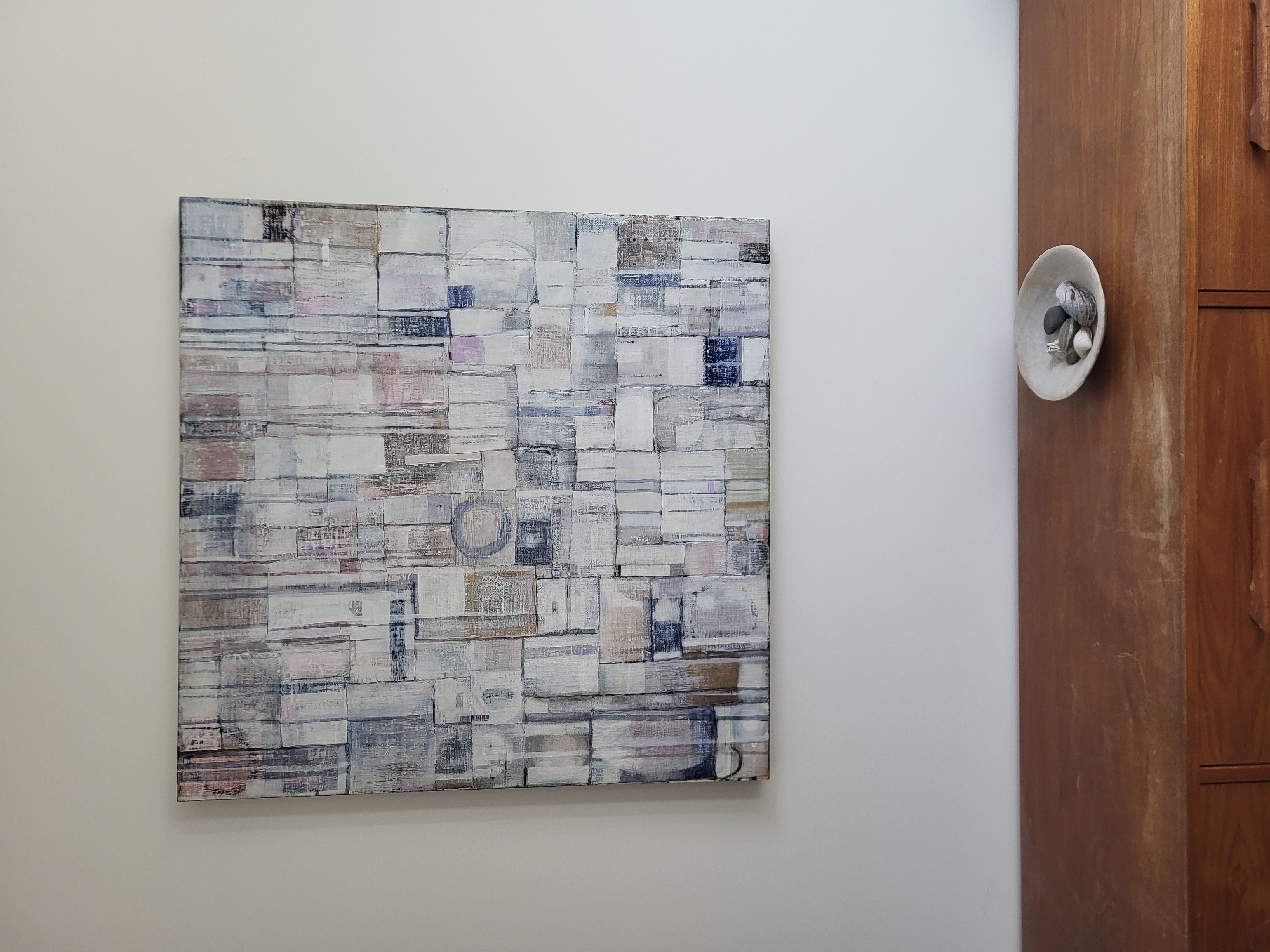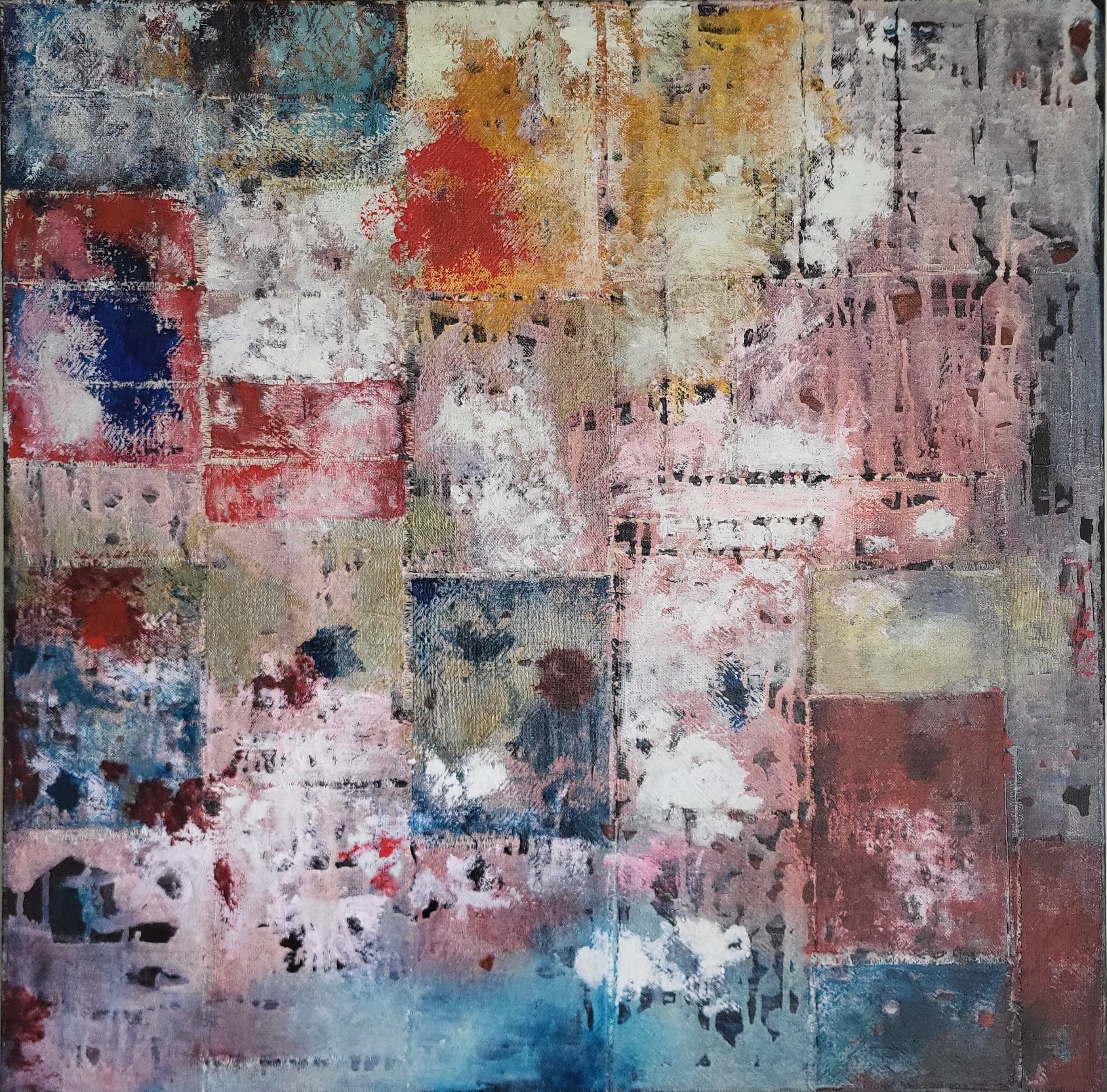 Reweavelinen collage with textile on wood panel, 36" x 36", $2600